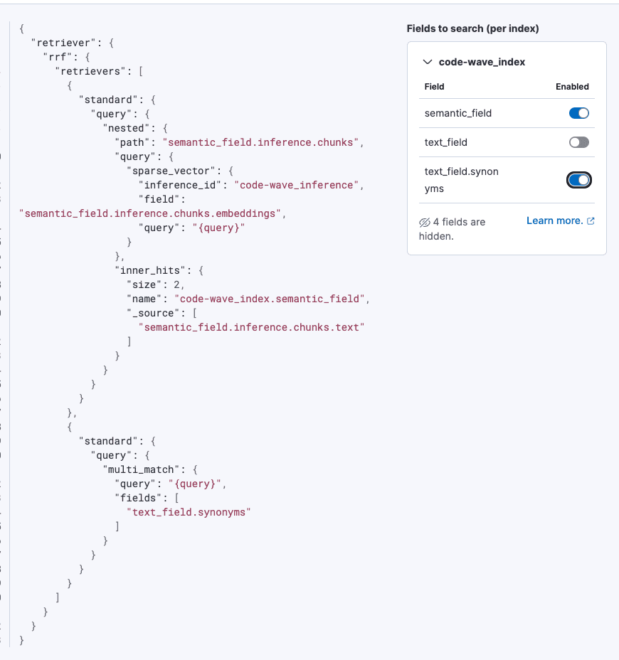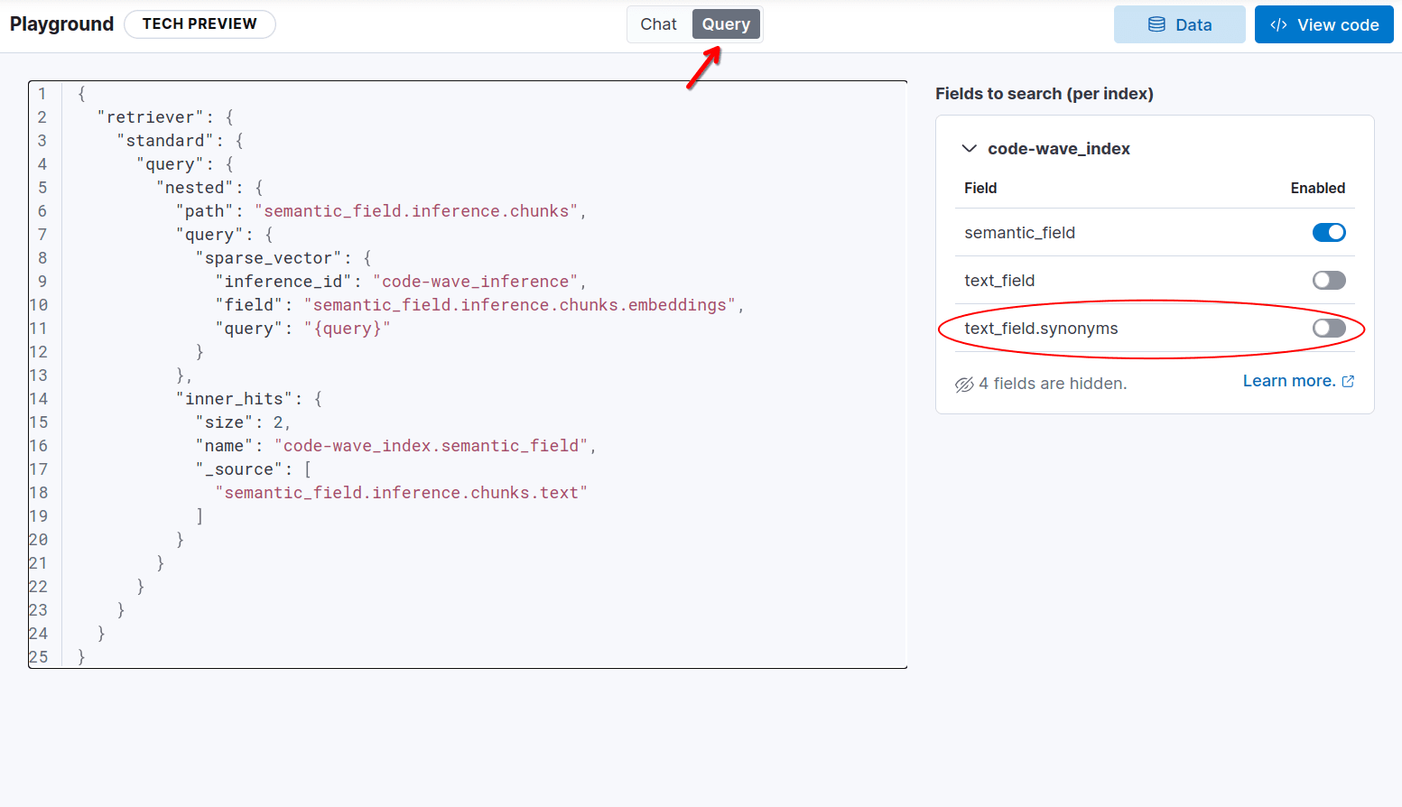 With Hybrid search we can do synonyms and semantic search at the same time, bringing the best of the two worlds. With Playground, if we select as search fields a combination of semantic, and text fields, a hybrid query will be built automatically for us.