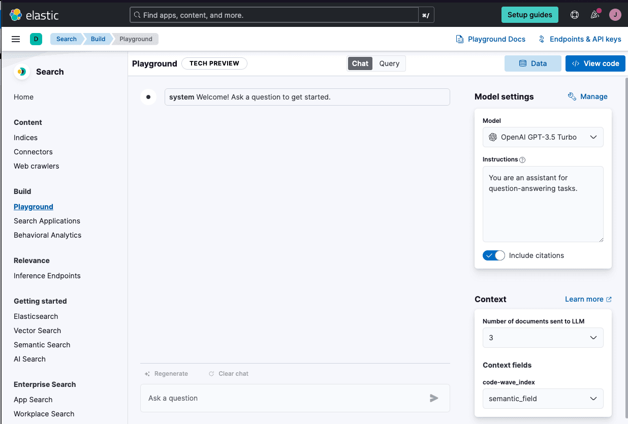 You can access Playground from Search>Playground. From there, you need to configure the LLM you want to use and select the index we've already created to be sent as context. You can read more about Playground and its configuration here