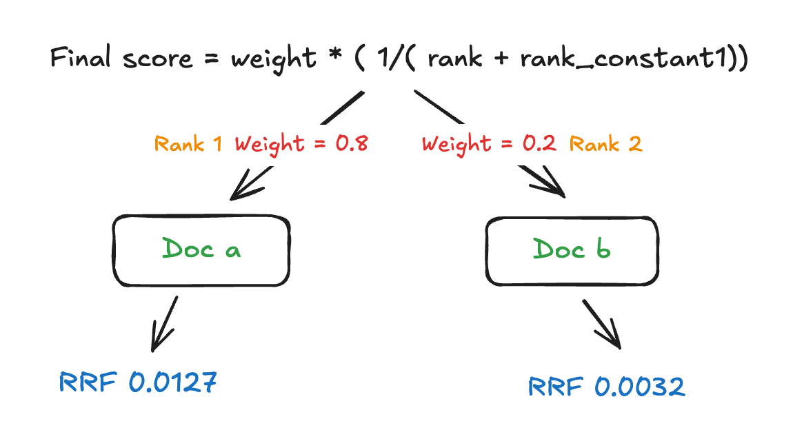 Example with rank_constant = 60. Each retriever contributes: weight × 1 / (rank + rank_constant). Higher weights increase influence; ranks start at 1.